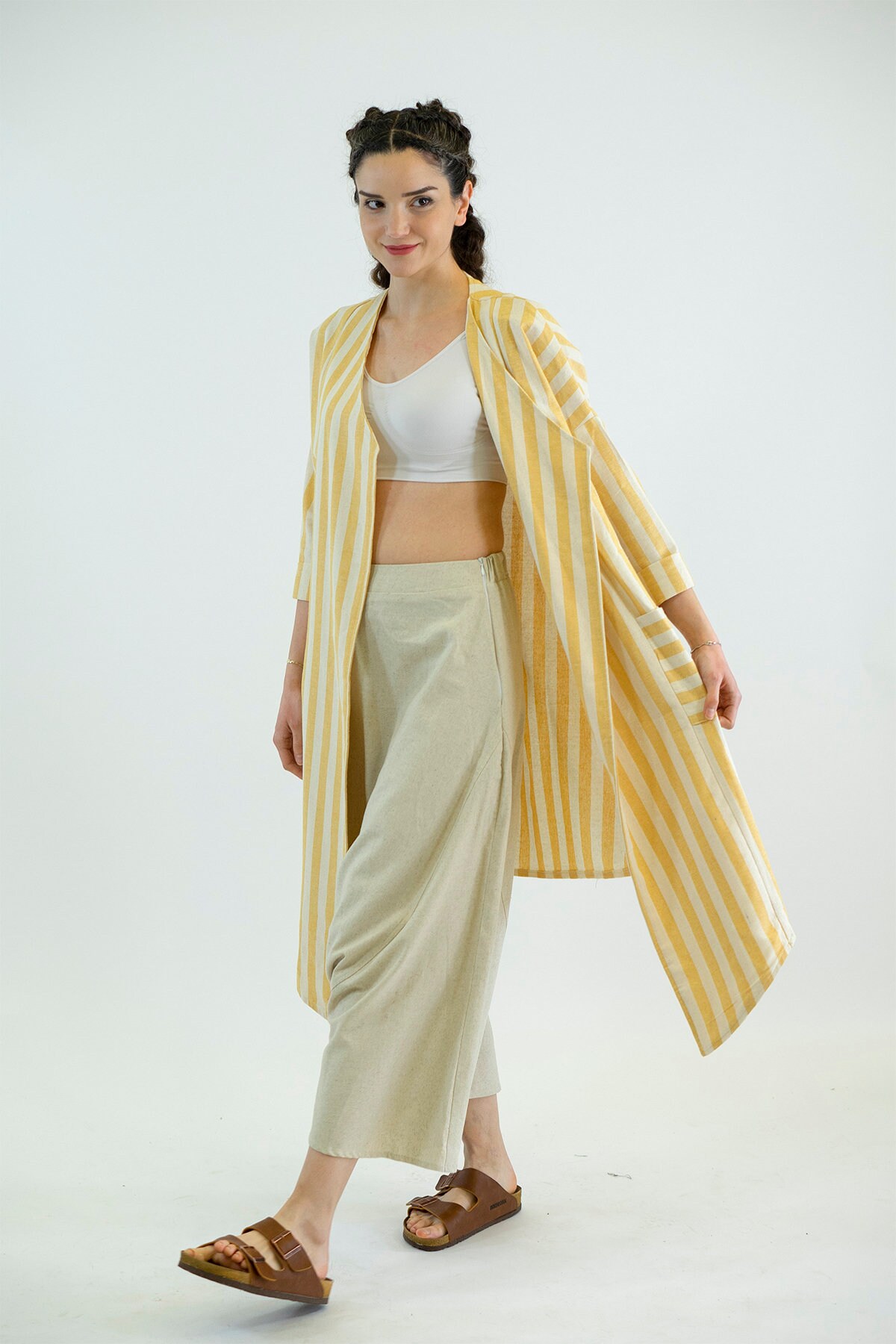 Our Sunshine yellow and white strap kimono adds a style, and comfort to your wardrobe.